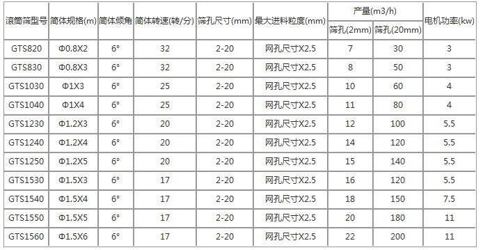 滾筒篩技術參數: