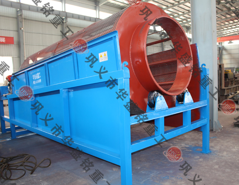 滾筒篩主要有電機、減速機、滾筒裝置、機架、密封蓋、進出料口組成。工作時電動機經減速機與滾筒裝置通過聯軸器連接在一起,驅動滾筒裝置繞其軸線轉動。當物料進入滾筒裝置后,由于滾筒裝置的傾斜與轉動,使篩面上的物料翻轉與滾動,使合格物料經滾筒外圓的篩網排出,不合格的物料經滾筒末端排出。由于物料在滾筒內的翻轉、滾動,使卡在篩孔中的物料可被彈出,可防止篩孔堵塞。華盛銘重工滾筒篩配套有拍打裝置,利用主電機多余的能量來傳動,不管物料有多么粘,都能輕松篩分,不存在篩孔堵塞現象。