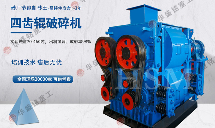四齒輥破碎機物料進入上面兩輥V型破碎腔以后,受到上兩輥相對旋轉的擠壓力作用,將物料擠軋和嚙磨后再進入相對旋轉的中間兩輥,利用中間兩輥的擠壓力進行二次擠軋和細破后,然后進入下兩輥破碎成需要的粒度由輸送設備送出。