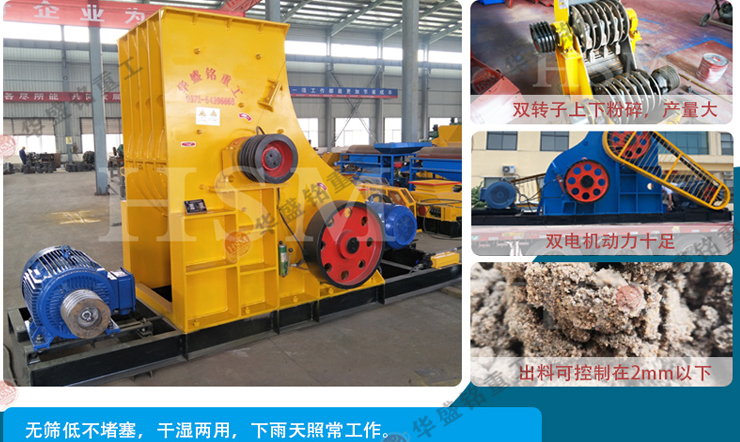 雙級破碎機也稱雙級錘式制砂機,雙轉子錘式細碎機,內無篩網、不留余渣、物料干、濕度不限,進料粒度不限,不管任何形狀的煤泥,可直接進機粉碎。雙轉子上下兩級粉碎,互相串連的兩套轉子,使經上級轉子擊碎物料即被飛速旋轉的下級轉子的錘頭再次細碎,腔物料相互飛速碰撞,相互粉碎,達到錘粉料、料粉料效果,出料粒度小于3毫米,適用于方解石、石灰巖、爐渣、礦渣等物料。設計了移位調隙技術,當錘頭磨損后不需修復,移動位置反復使用,通常一副錘頭可頂多副使用。